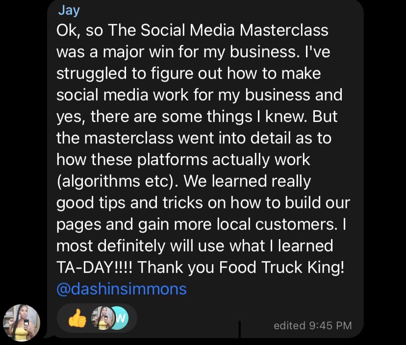 Before starting my Food Truck I owned a Marketing Agency called Simmons Social and I made my clients multiple 7 figures in restaurant sales.Â